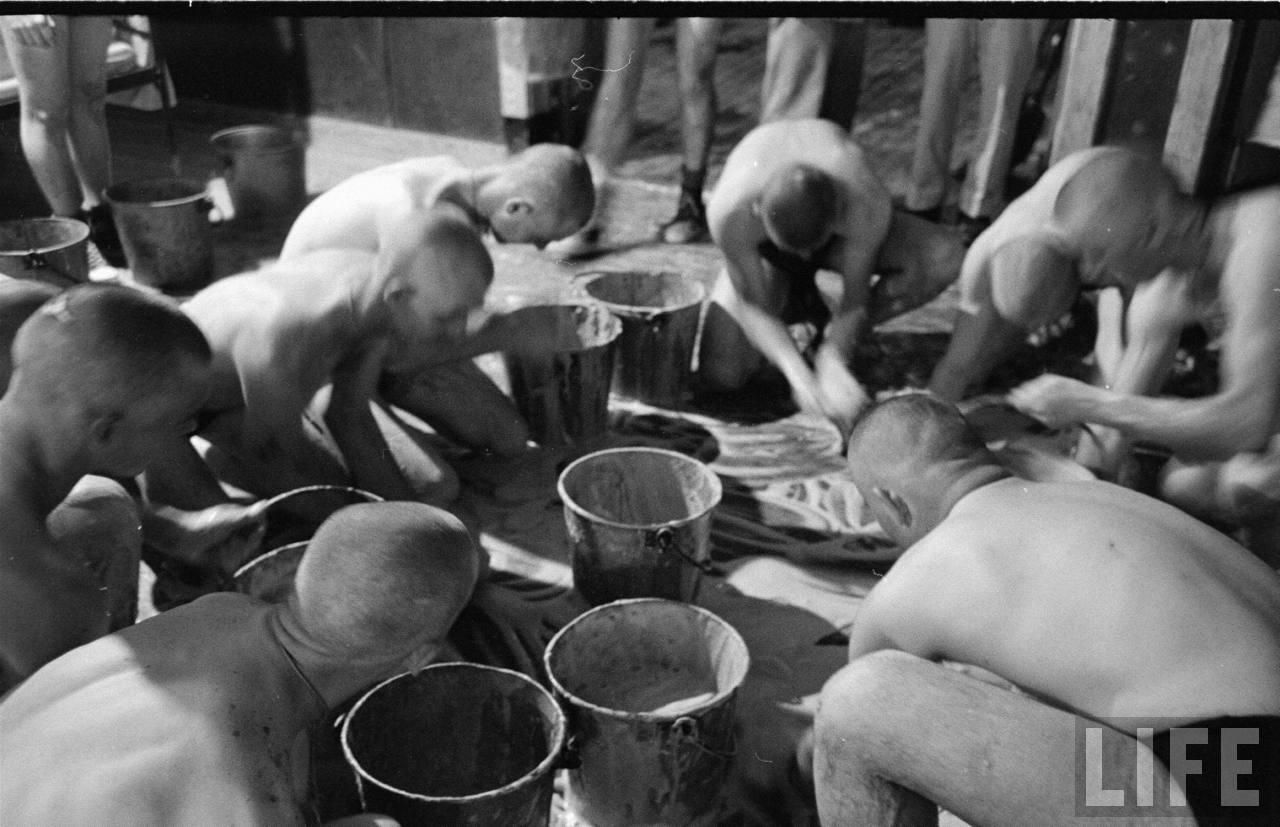 Premier lessivage, les recrues ont encore des cheveux, mais tous déjà un identique slip noir, celui qui plus tard servira au cirage des pompes et aux T.I.G.